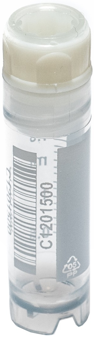 The type of the cryovial tube is CL2ARBIPSTS from Biosigma: Barcoded Cryotube 2 ml, internal thread cap, skirted, sterile, graduated, writing area, CLEARLINE. Barcode Code 128.